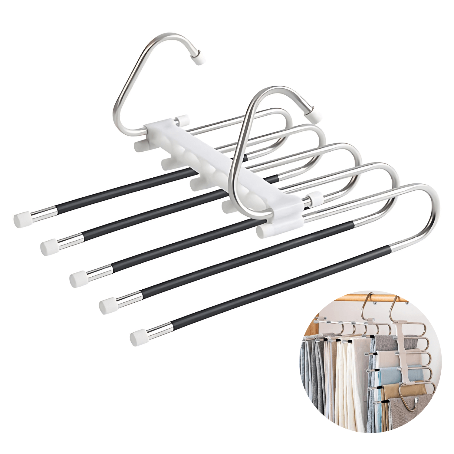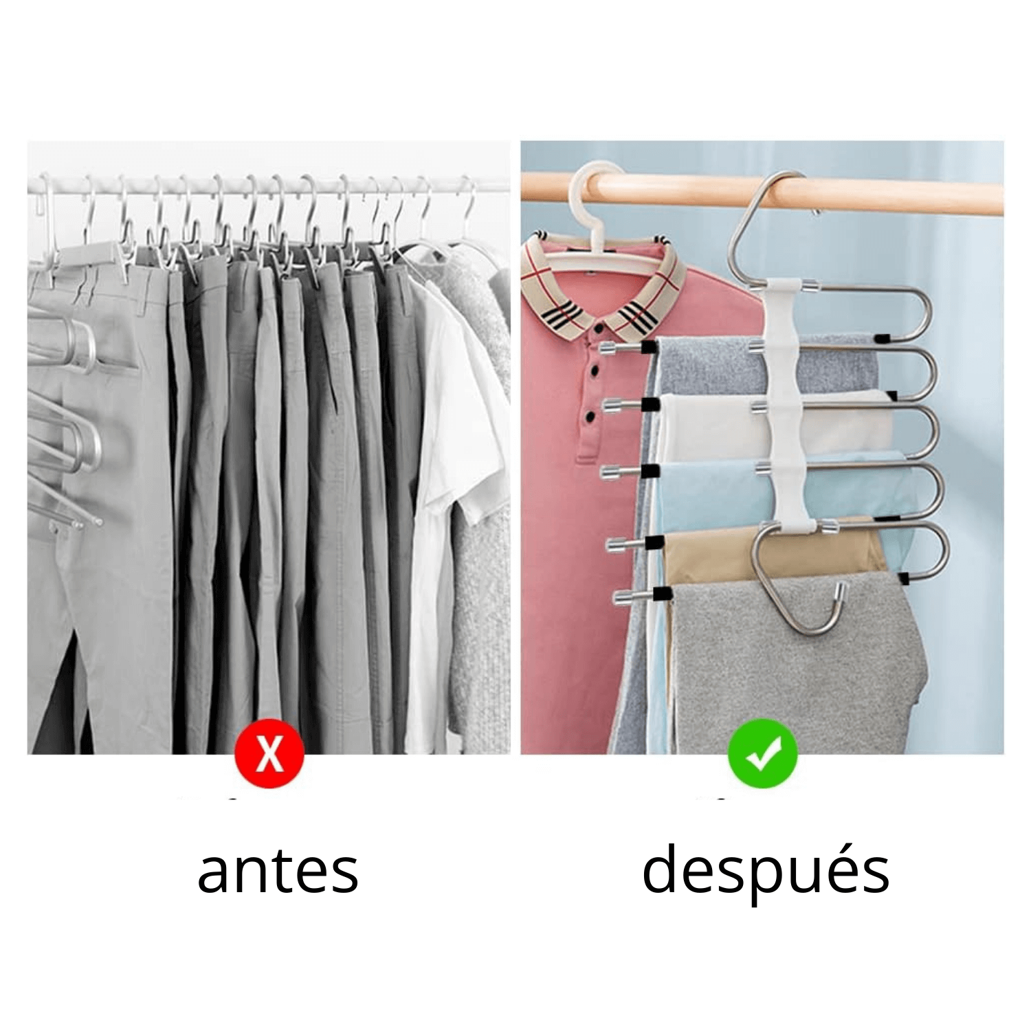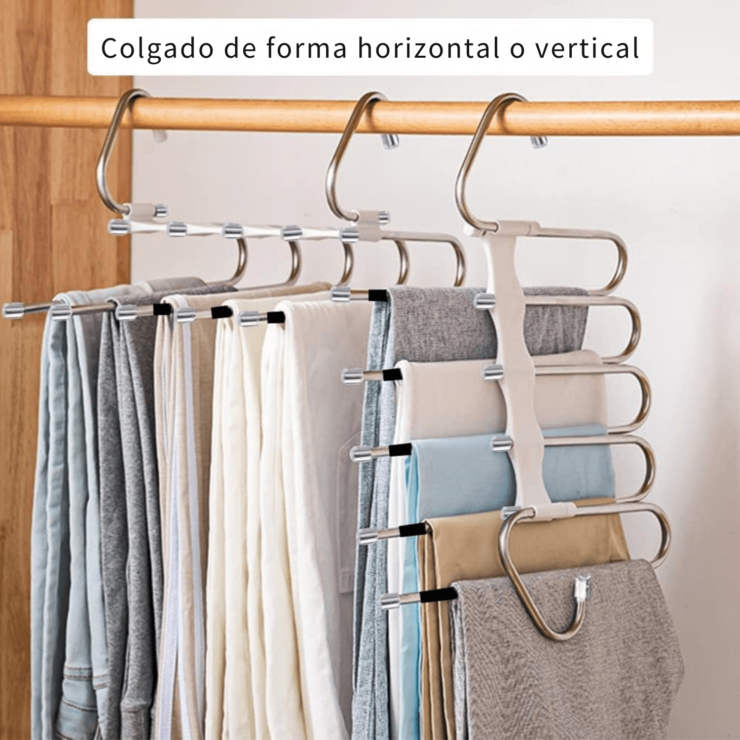 Perfecto para hogares pequeños o para quienes tienen muchas prendas que organizar. Además, el caucho antideslizante garantiza que tus pantalones y otras prendas se mantengan en su lugar, evitando accidentes y desorden.